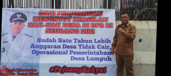 Dia mendatangi gedung DPR RI Jalan Gatot Subroto, Jakarta pada, Kamis, (18/4/2024) dengan membawa spanduk untuk ditempel di Gedung DPR RI. Maksud dan tujuannya datang ke Gedung DPR RI tersebut, untuk meminta dukungan kepada anggota dewan agar dana desa bisa segera dicairkan.