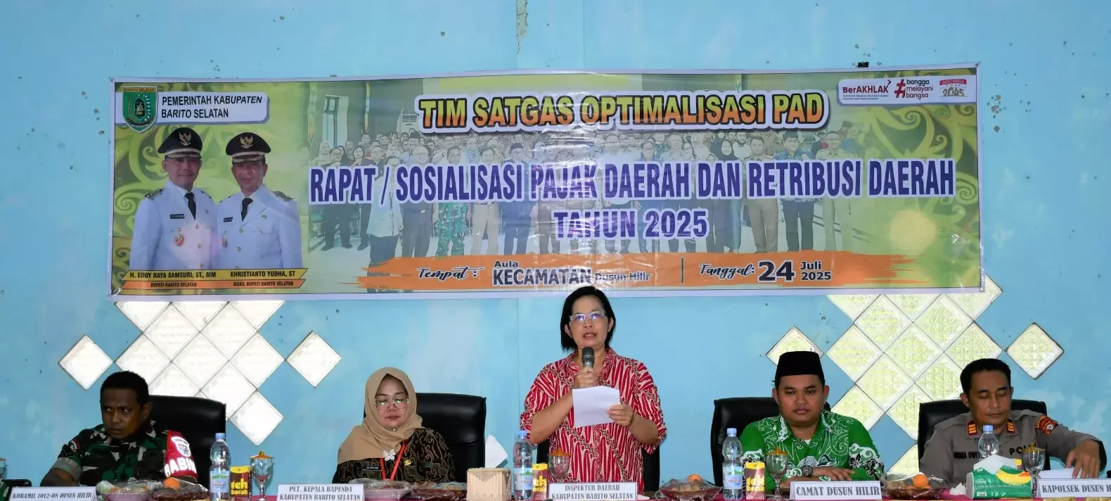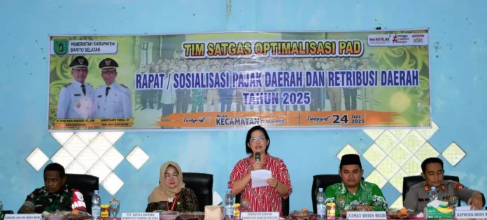 BUNTOK – Pemerintah Kabupaten Barito Selatan (Barsel) terus berupaya meningkatkan kesadaran wajib pajak dan optimalisasi Pendapatan Asli Daerah (PAD). Melalui Badan Pendapatan Daerah (Bapenda), kegiatan Sosialisasi Pajak Daerah dan Retribusi Daerah Tahun 2025 digelar di Aula Kantor Kecamatan Dusun Hilir, Kamis (24/7/2025).