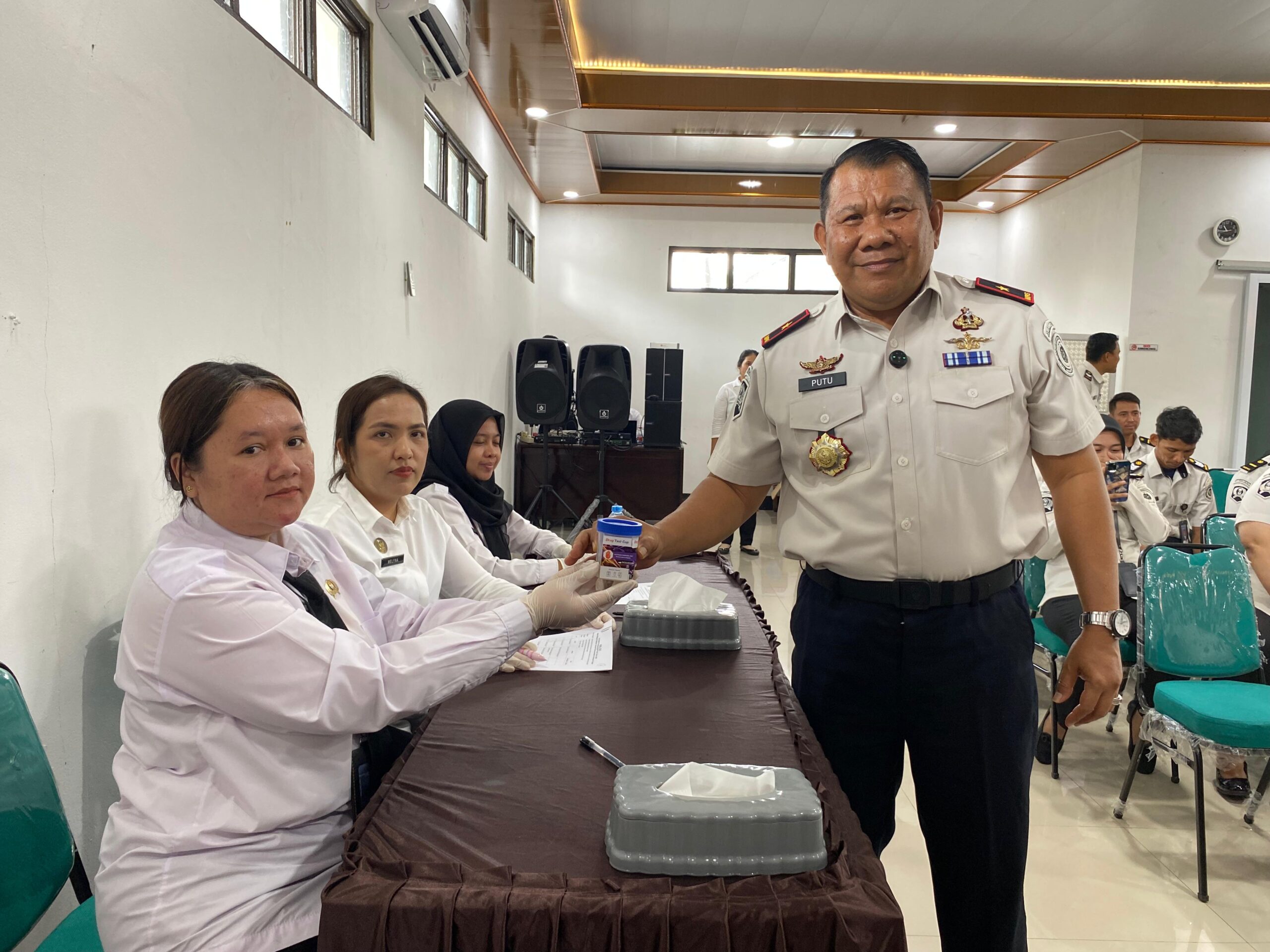 Pelaksanaan tes urine berlangsung di Aula Tjilik Riwut Kantor Wilayah dan diikuti langsung oleh Kepala Kantor Wilayah Direktorat Jenderal Pemasyarakatan Kalimantan Tengah, I Putu Murdiana, bersama seluruh pejabat administrator serta pegawai di lingkungan Kanwil.