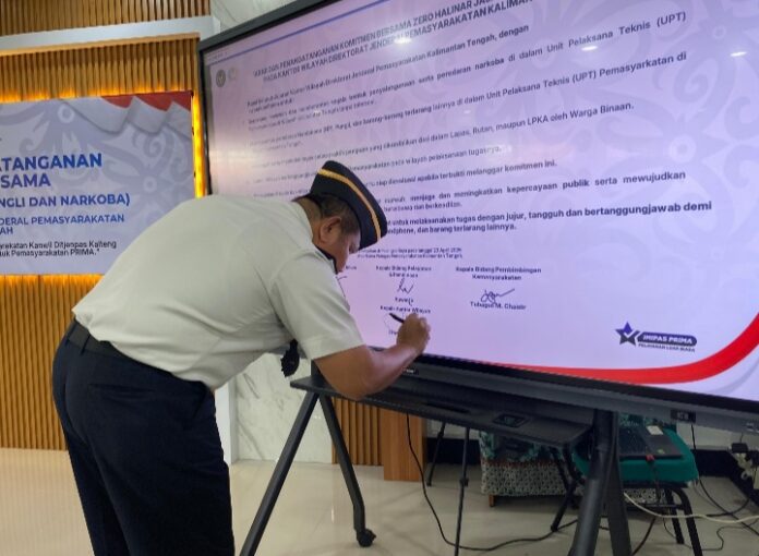PALANGKA RAYA – Seluruh Unit Pelaksana Teknis (UPT) Pemasyarakatan di Kalimantan Tengah bergerak dalam satu komando. Ikrar dan penandatanganan komitmen bersama Zero Halinar (handphone, pungli, dan narkoba) digelar serentak, Kamis (23/4), sebagai langkah tegas membersihkan praktik terlarang di lingkungan lapas dan rutan.